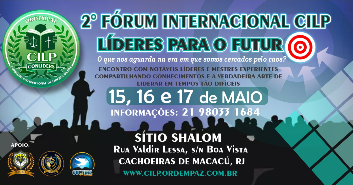 O CILP - CONSELHO INTERNACIONAL DE LÍDERES DA PAZ, CONVIDA VOCÊ PARA O SEU 2° FÓRUM, CUJO PROPÓSITO PRINCIPAL É O DE PREPARAR LÍDERES CRISTÃOS PARA ESSA ÚLTIMA GERAÇÃO, ONDE OS DIAS SÃO DIFÍCEIS CONFORME NOS REVELA AS ESCRITURAS, E DE ACORDO COM O QUE PRESENCIAMOS NOS DIAS ATUAIS. DE FATO, AS PROFECIAS BÍBLICAS ACERCA DESTE TEMPO, SÃO IRREFUTÁVEIS, ONDE NÓS ENCONTRAMOS UMA SOCIEDADE QUE VEM ADOECENDO, TANTO PSICOLOGICAMENTE, COMO FISICAMENTE, E ESPIRITUALMENTE. NOSSA INSTITUÍÇÃO DIANTE DA PERCEPÇÃO DESTE QUADRO NEGATIVO DA ATUALIDADE, SE EMPENHA A MINORAR OS PROBLEMAS SOCIAIS E ECLESIÁSTICOS BUSCANDO PREPARAR, DIRECIONAR, ACONSELHAR, INSTRUIR E FORTALECER TODAS AS LIDERANÇAS POSSÍVEIS NESSA COMPLEXA GERAÇÃO.